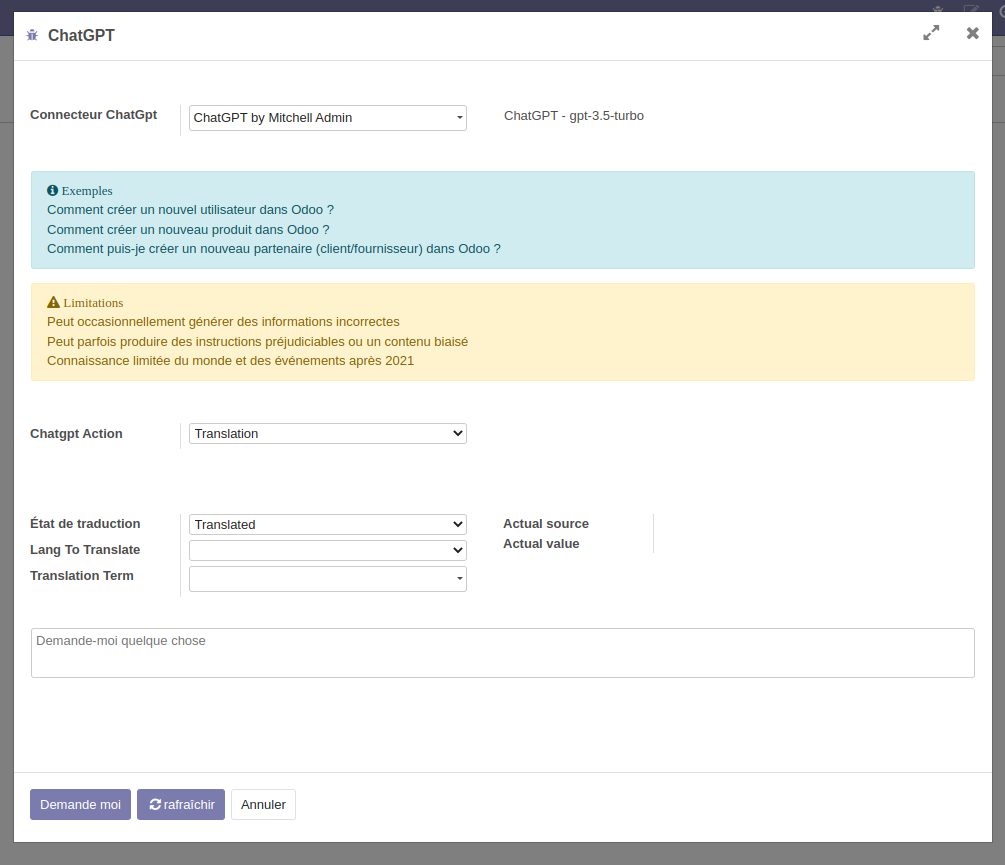 La traduction est un élément essentiel pour les entreprises opérant à l'échelle internationale. Pour répondre aux besoins croissants en matière de traduction et simplifier ce processus complexe, l'intégration de ChatGPT dans Odoo, une solution de gestion d'entreprise tout-en-un, offre une approche novatrice et pertinente. Cette intégration révolutionnaire permet aux entreprises de gérer facilement les traductions, d'améliorer l'efficacité et de réduire les coûts associés à la localisation de contenu.